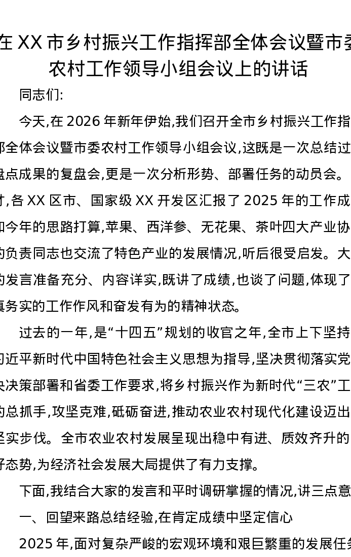 在XX市乡村振兴工作指挥部全体会议暨市委农村工作领导小组会议上的讲话1