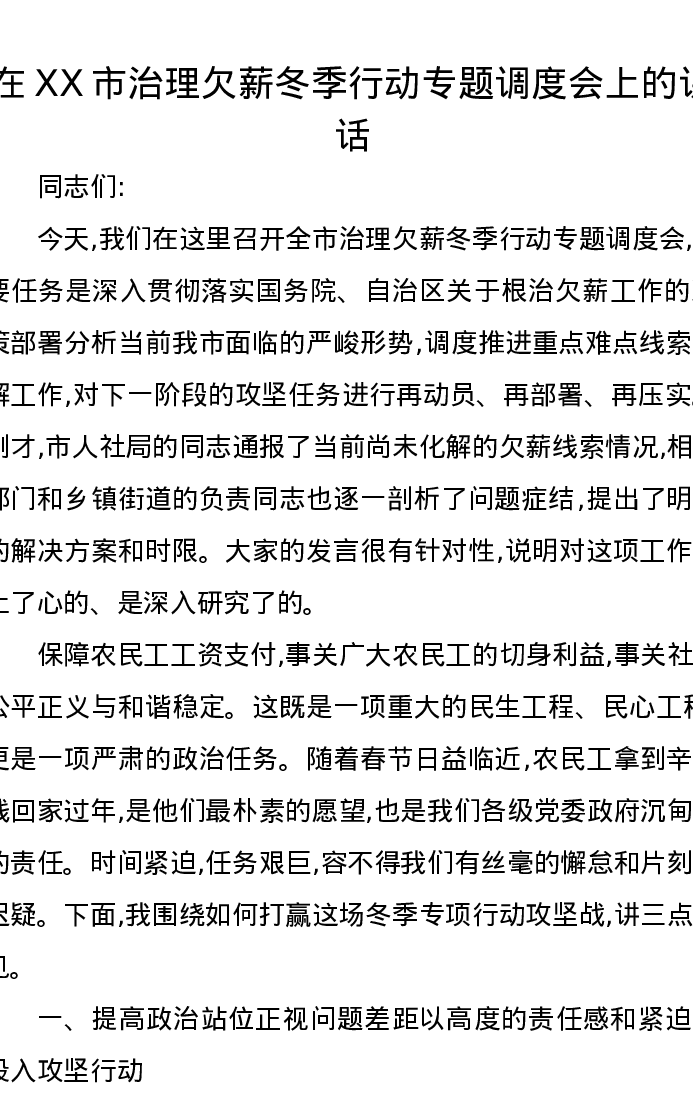 在XX市治理欠薪冬季行动专题调度会上的讲话