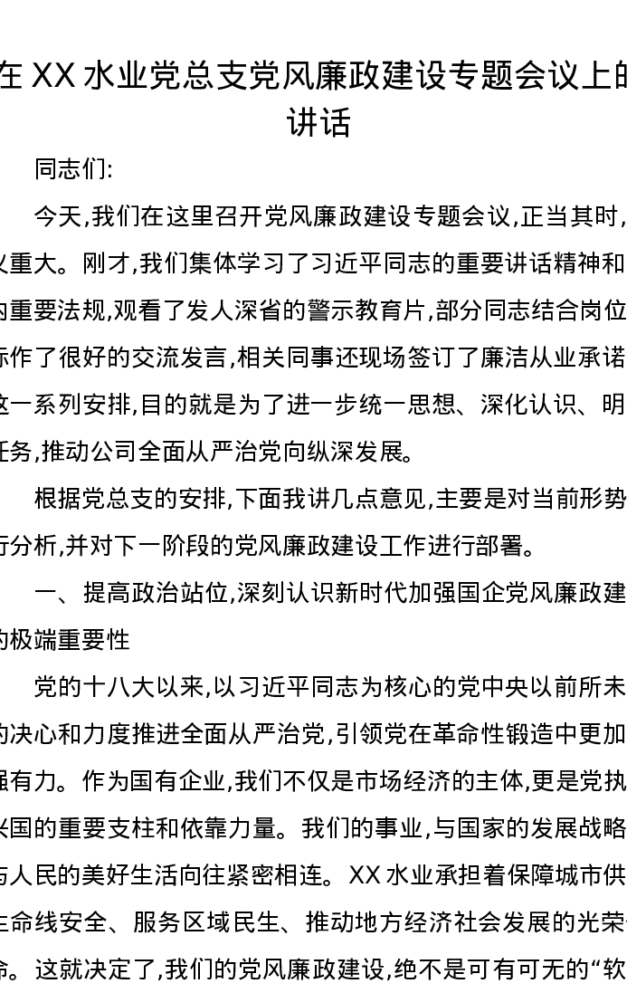 在XX水业党总支党风廉政建设专题会议上的讲话