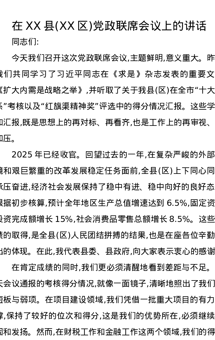 在XX县(XX区)党政联席会议上的讲话