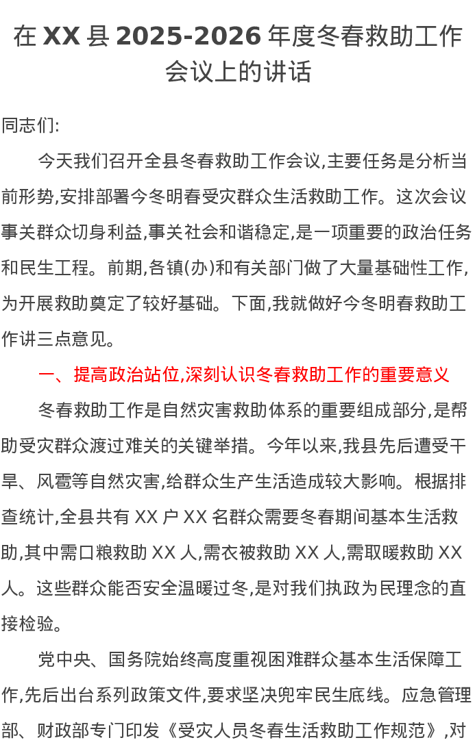 在XX县2025-2026年度冬春救助工作会议上的讲话