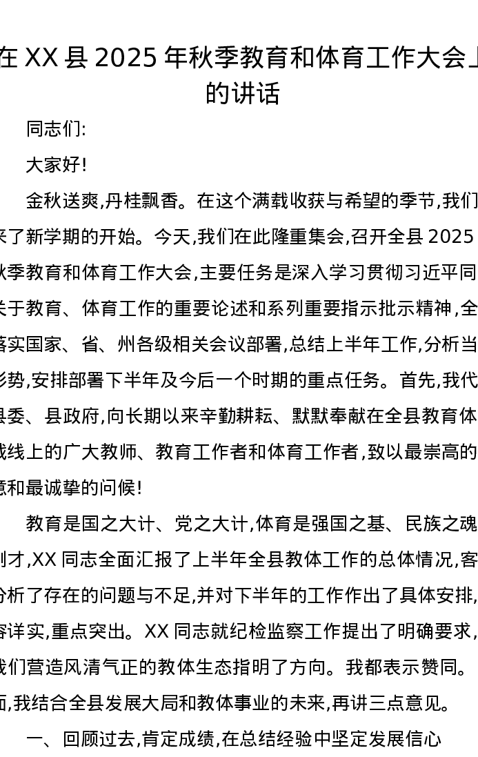 在XX县2025年秋季教育和体育工作大会上的讲话