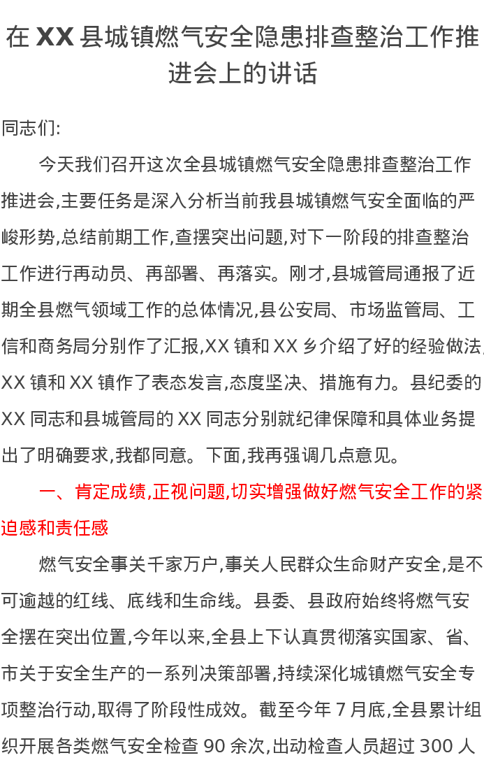在XX县城镇燃气安全隐患排查整治工作推进会上的讲话