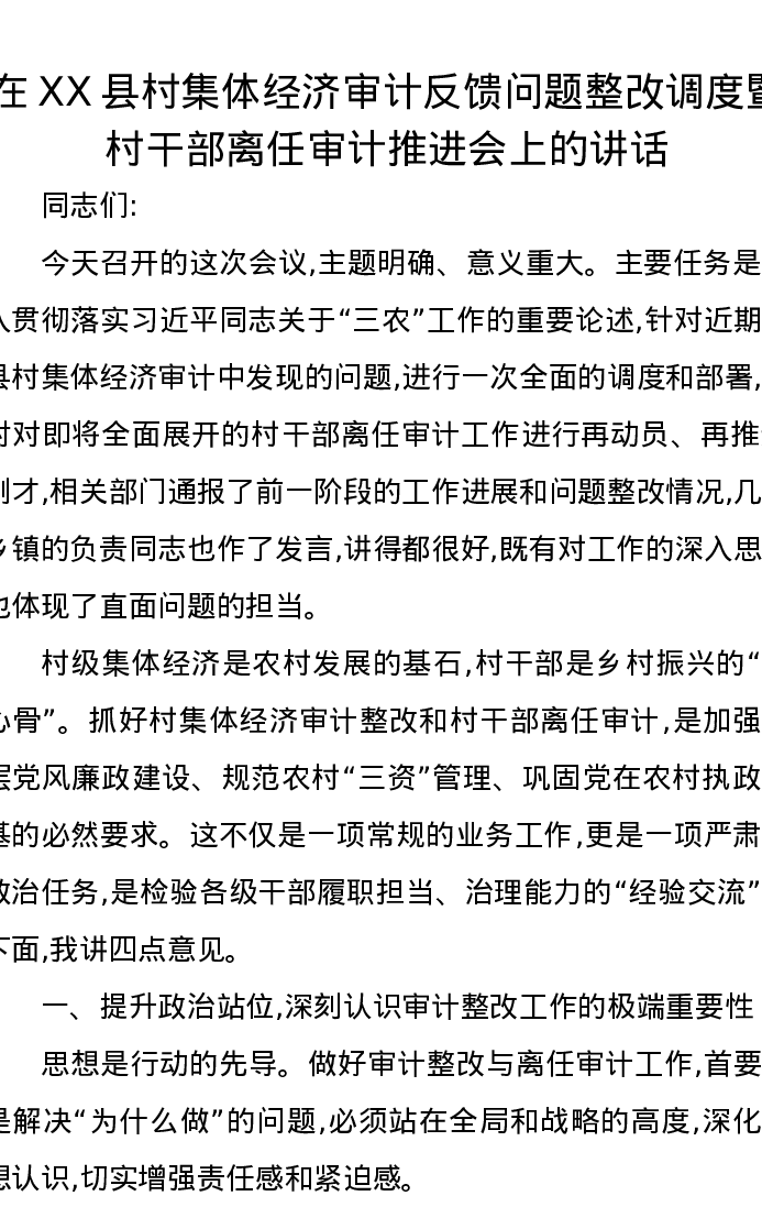 在XX县村集体经济审计反馈问题整改调度暨村干部离任审计推进会上的讲话