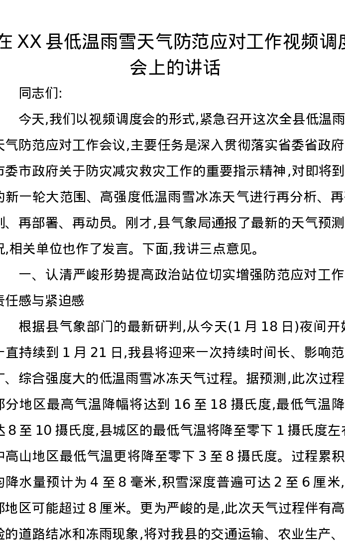 在XX县低温雨雪天气防范应对工作视频调度会上的讲话