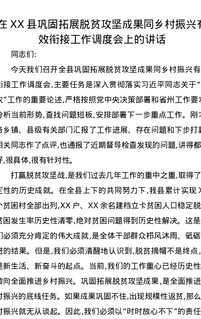 在XX县巩固拓展脱贫攻坚成果同乡村振兴有效衔接工作调度会上的讲话