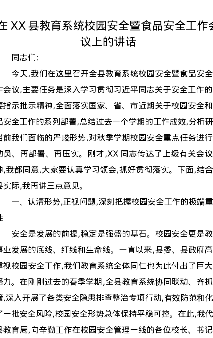 在XX县教育系统校园安全暨食品安全工作会议上的讲话