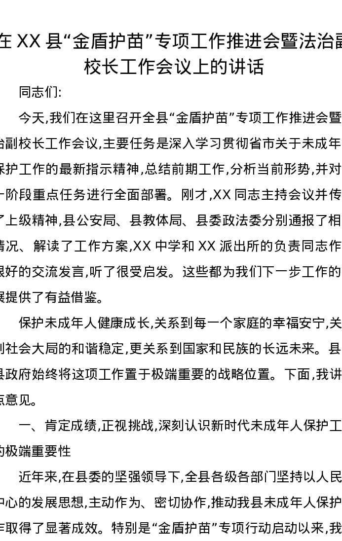 在XX县金盾护苗专项工作推进会暨法治副校长工作会议上的讲话