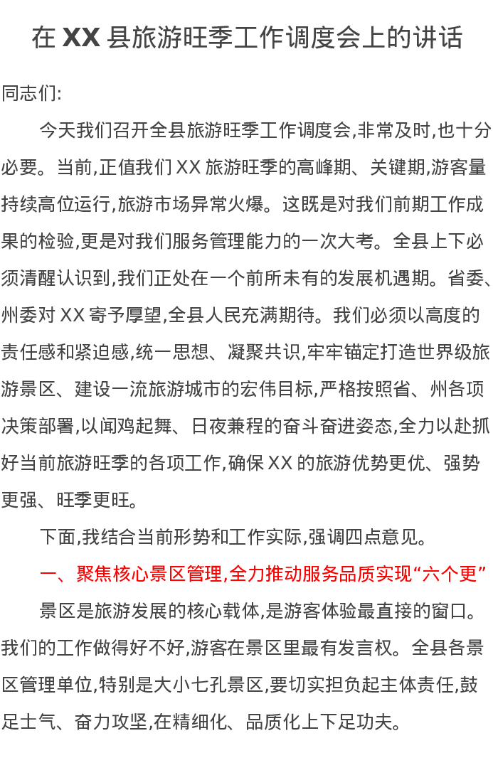 在XX县旅游旺季工作调度会上的讲话