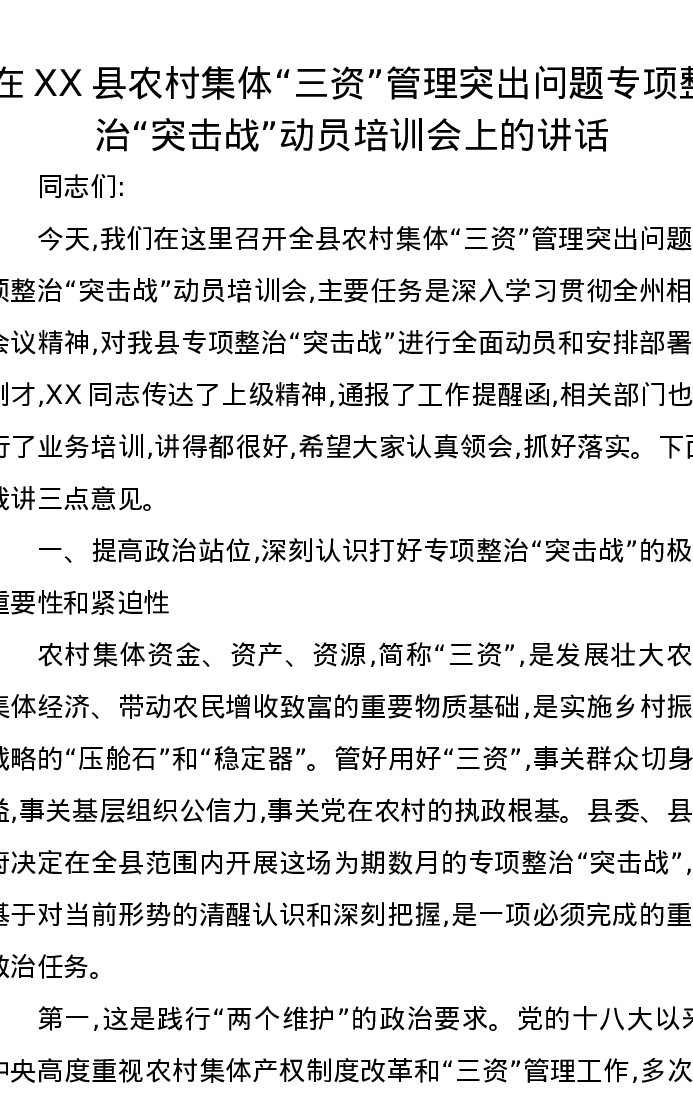 在XX县农村集体三资管理突出问题专项整治突击战动员培训会上的讲话