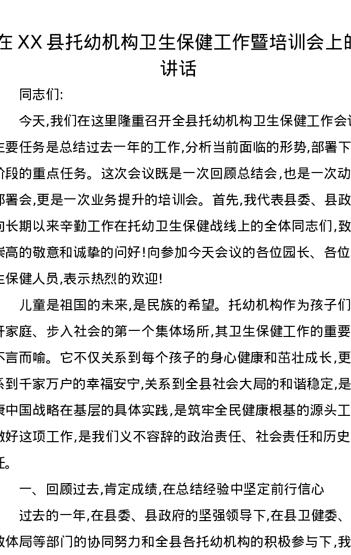 在XX县托幼机构卫生保健工作暨培训会上的讲话