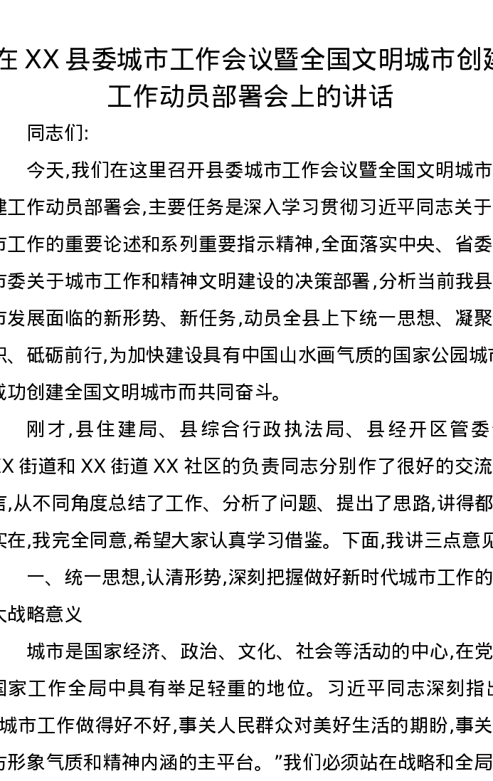 在XX县委城市工作会议暨全国文明城市创建工作动员部署会上的讲话