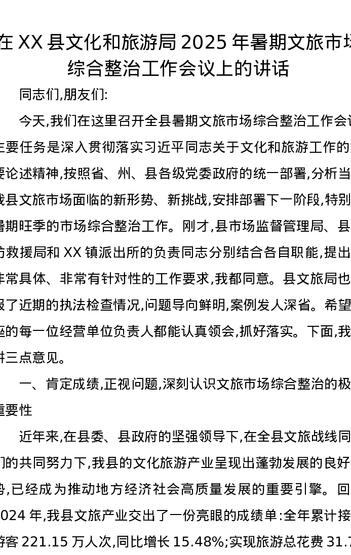 在XX县文化和旅游局2025年暑期文旅市场综合整治工作会议上的讲话