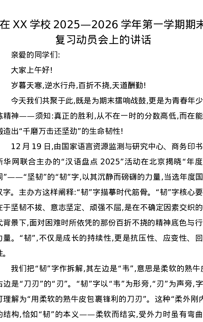 在XX学校2025—2026学年第一学期期末复习动员会上的讲话