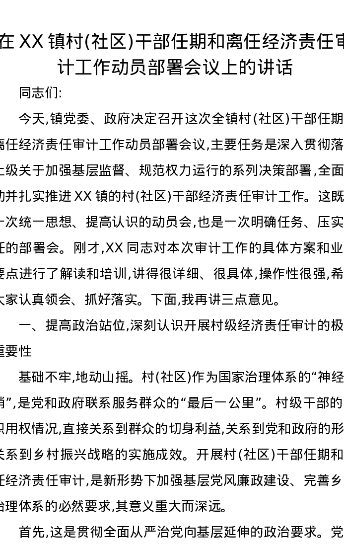 在XX镇村(社区)干部任期和离任经济责任审计工作动员部署会议上的讲话
