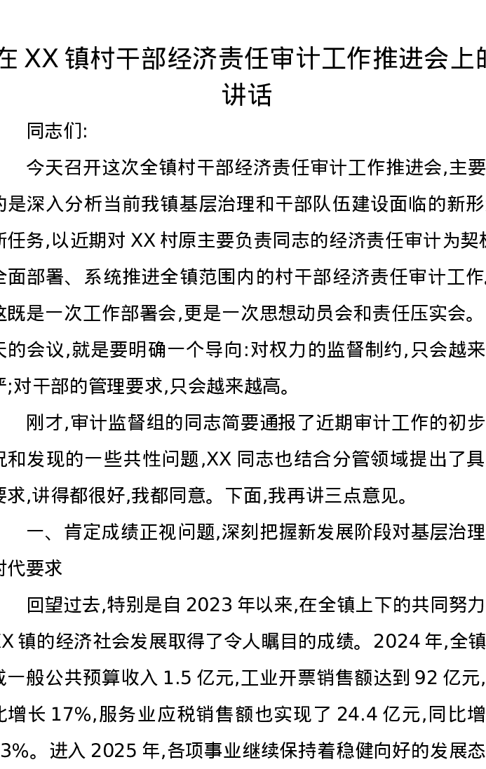 在XX镇村干部经济责任审计工作推进会上的讲话
