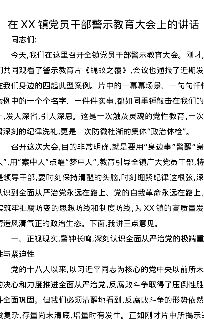 在XX镇党员干部警示教育大会上的讲话
