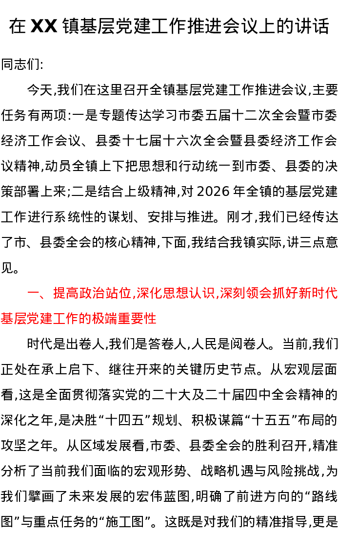 在XX镇基层党建工作推进会议上的讲话