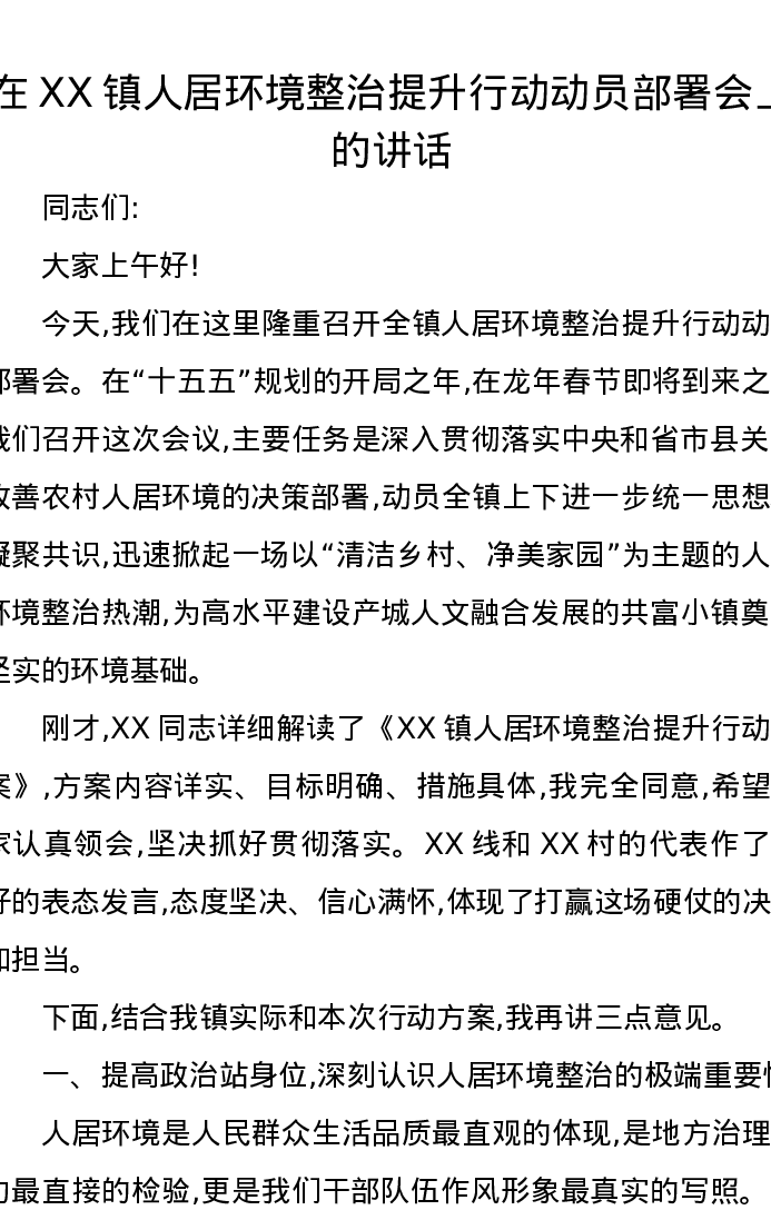 在XX镇人居环境整治提升行动动员部署会上的讲话