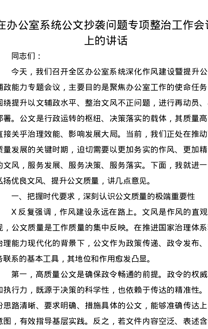 在办公室系统公文抄袭问题专项整治工作会议上的讲话