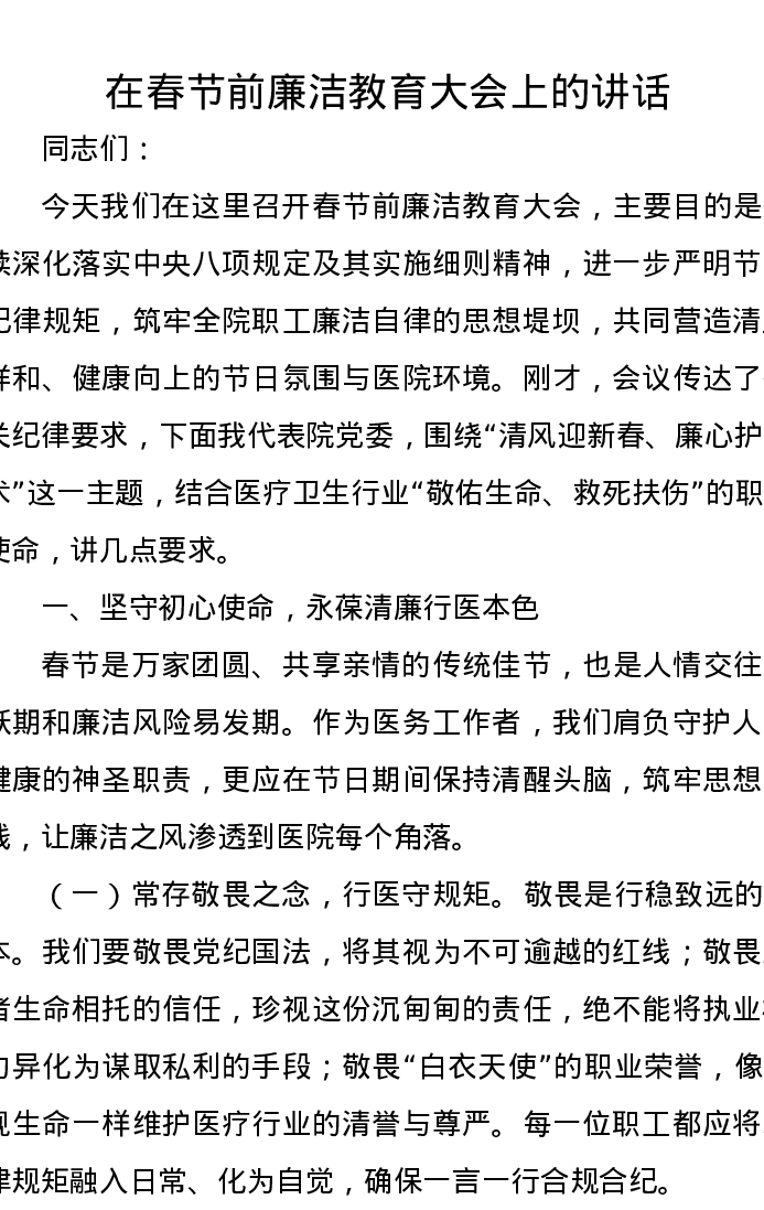在春节前廉洁教育大会上的讲话
