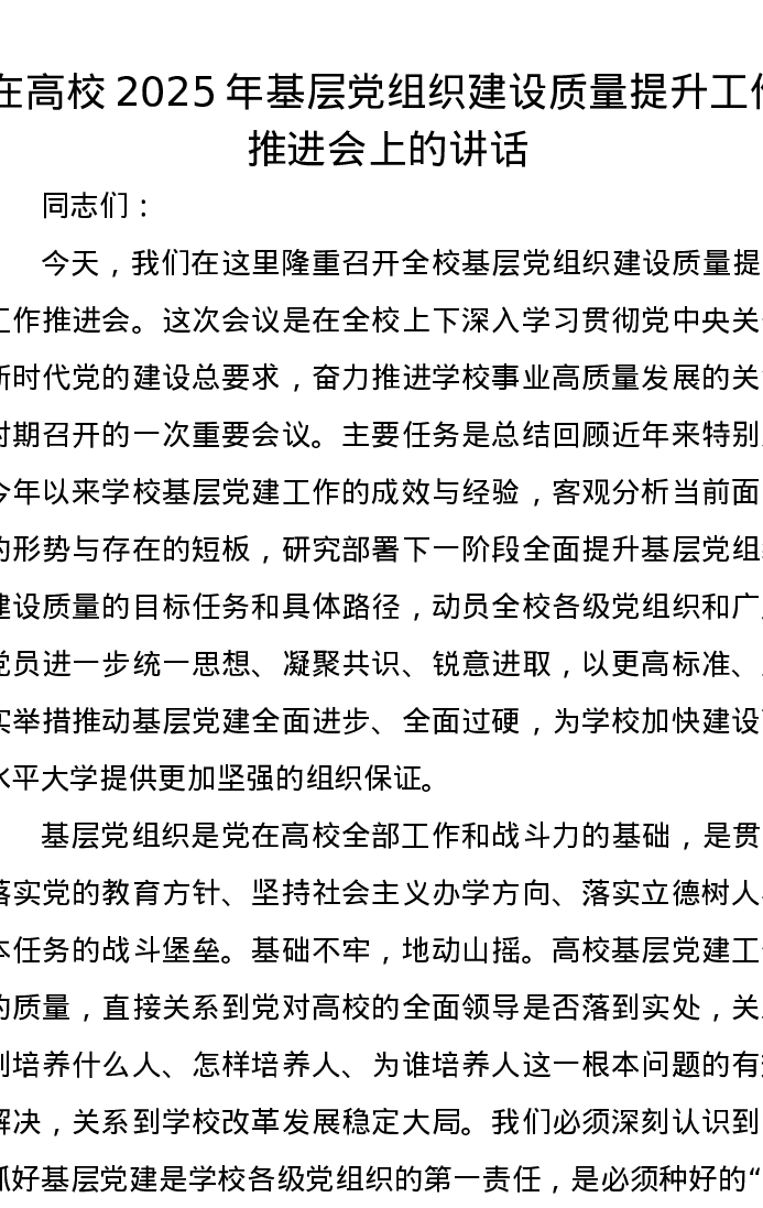在高校2025年基层党组织建设质量提升工作推进会上的讲话