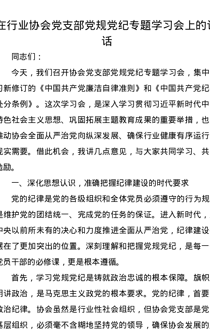 在行业协会党支部党规党纪专题学习会上的讲话