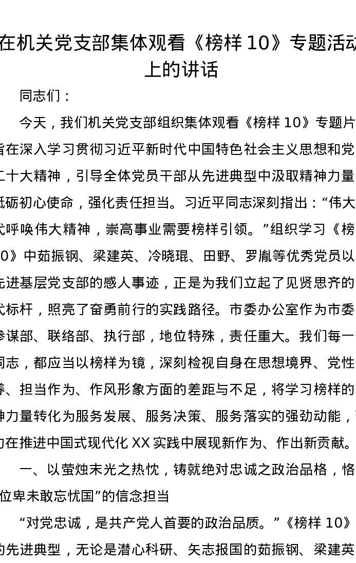 在机关党支部集体观看《榜样10》专题活动上的讲话