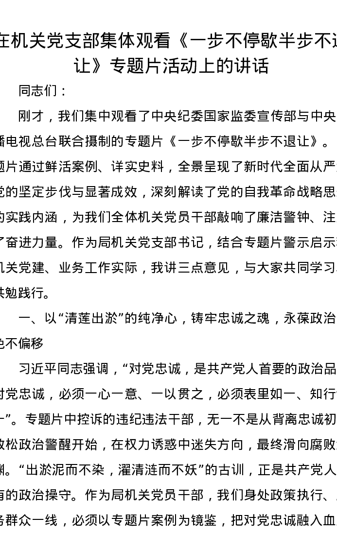 在机关党支部集体观看《一步不停歇半步不退让》专题片活动上的讲话