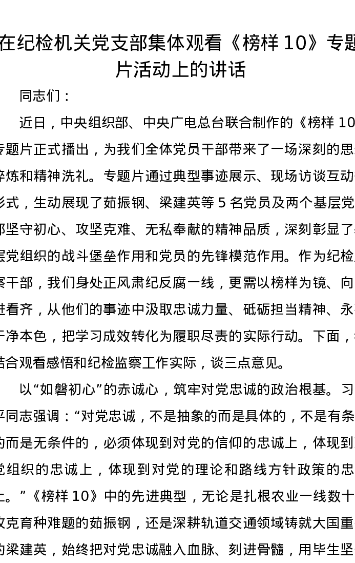 在纪检机关党支部集体观看《榜样10》专题片活动上的讲话