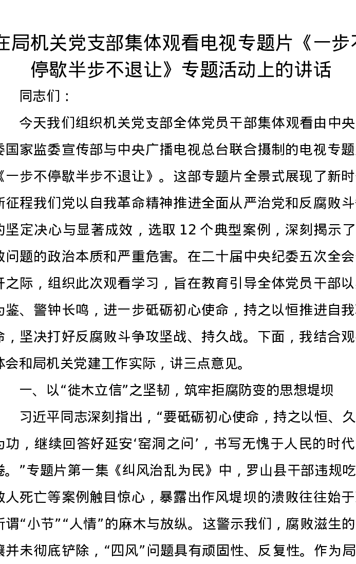 在局机关党支部集体观看电视专题片《一步不停歇半步不退让》专题活动上的讲话