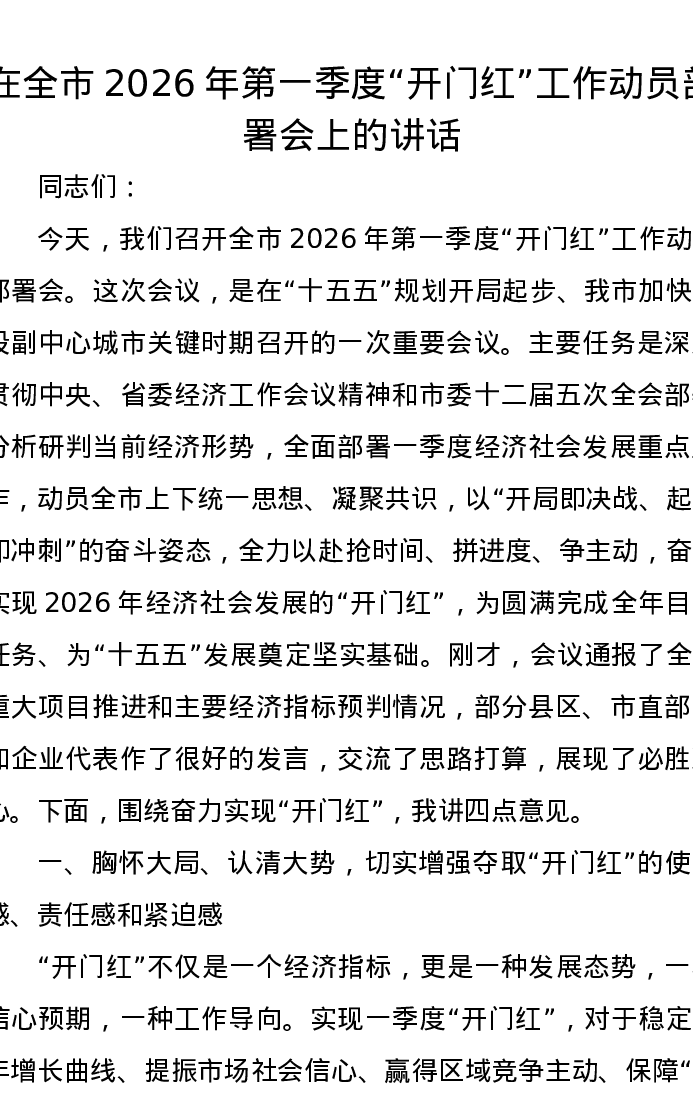 在全市2026年第一季度开门红工作动员部署会上的讲话