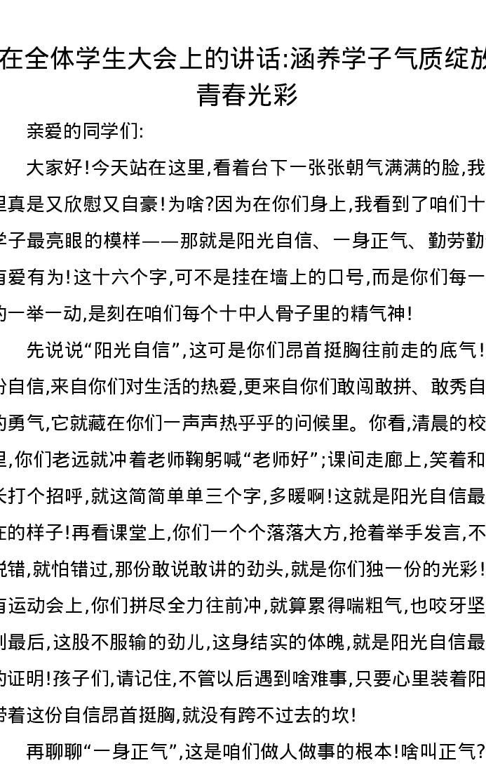 在全体学生大会上的讲话涵养学子气质绽放青春光彩