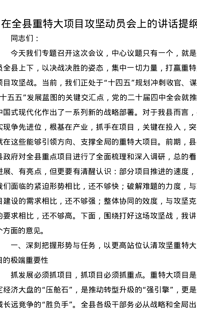 在全县重特大项目攻坚动员会上的讲话提纲