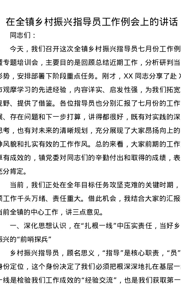 在全镇乡村振兴指导员工作例会上的讲话