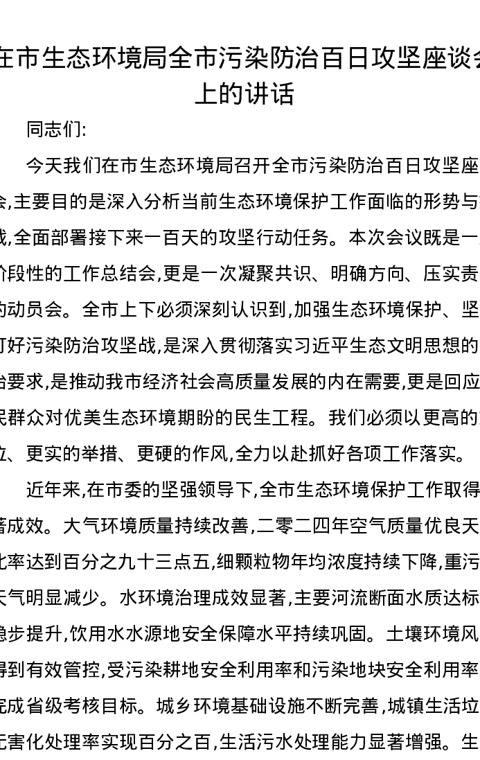 在市生态环境局全市污染防治百日攻坚座谈会上的讲话