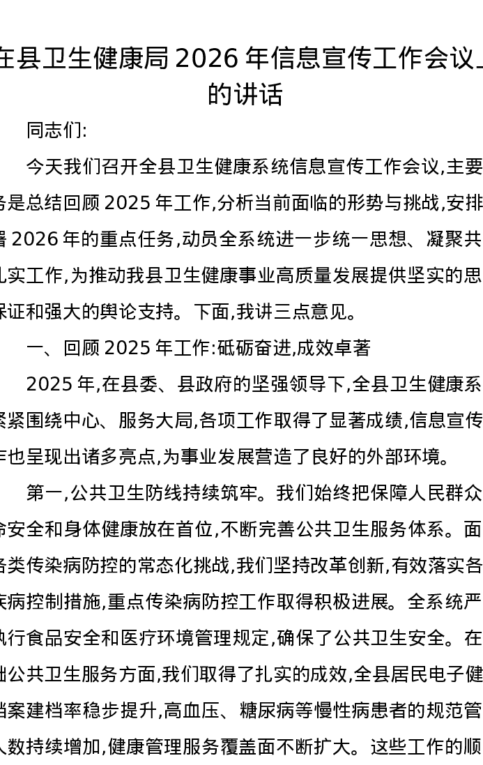 在县卫生健康局2026年信息宣传工作会议上的讲话