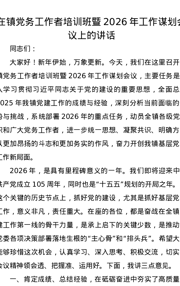 在镇党务工作者培训班暨2026年工作谋划会议上的讲话