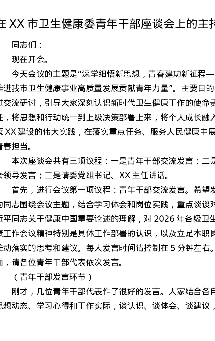 在XX市卫生健康委青年干部座谈会上的主持词
