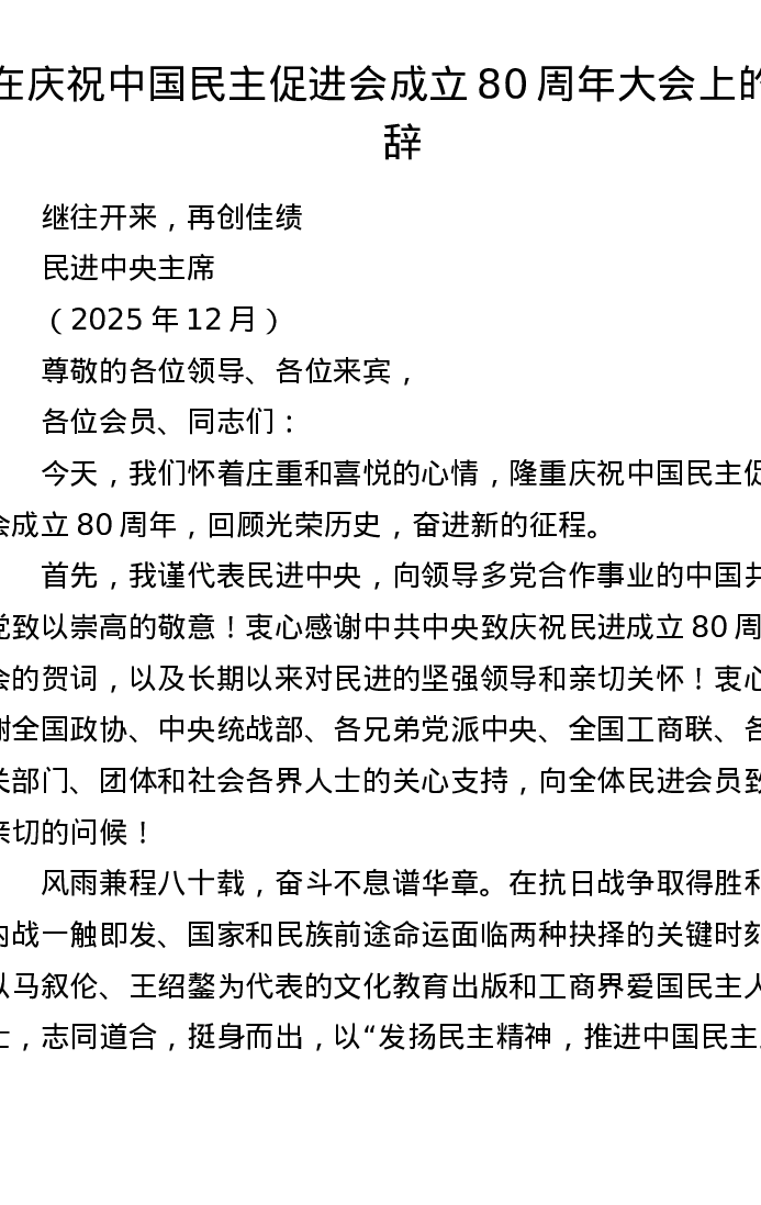 在庆祝中国民主促进会成立80周年大会上的致辞