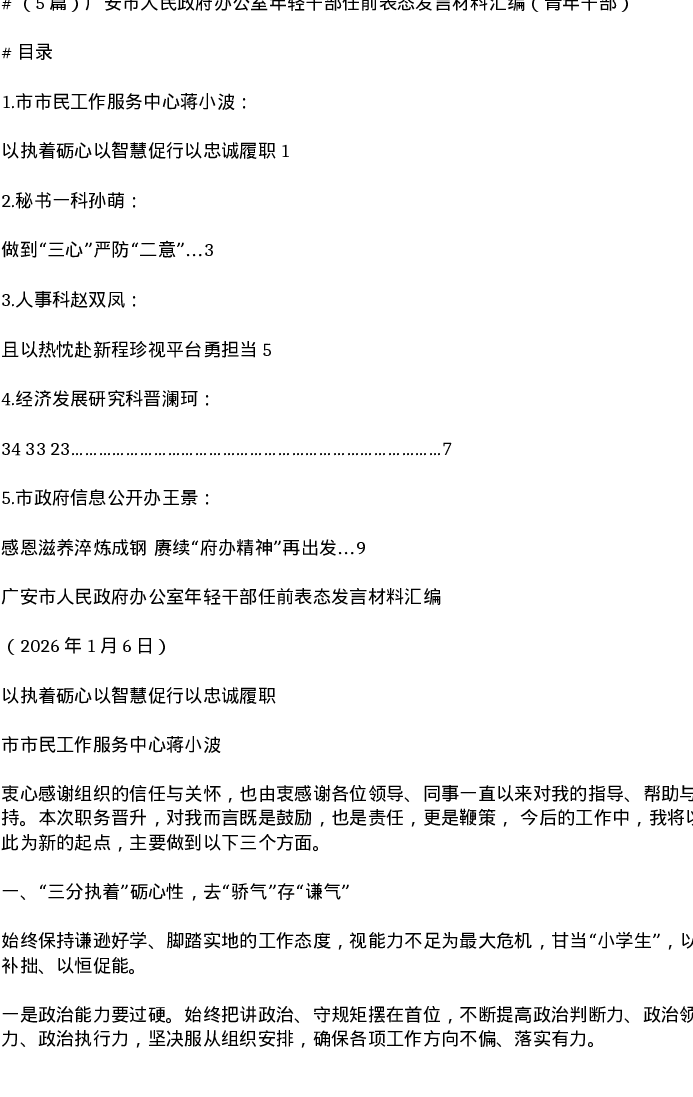 汇编:广安市人民政府办公室年轻干部任前表态发言材料汇编(青年干部)5篇