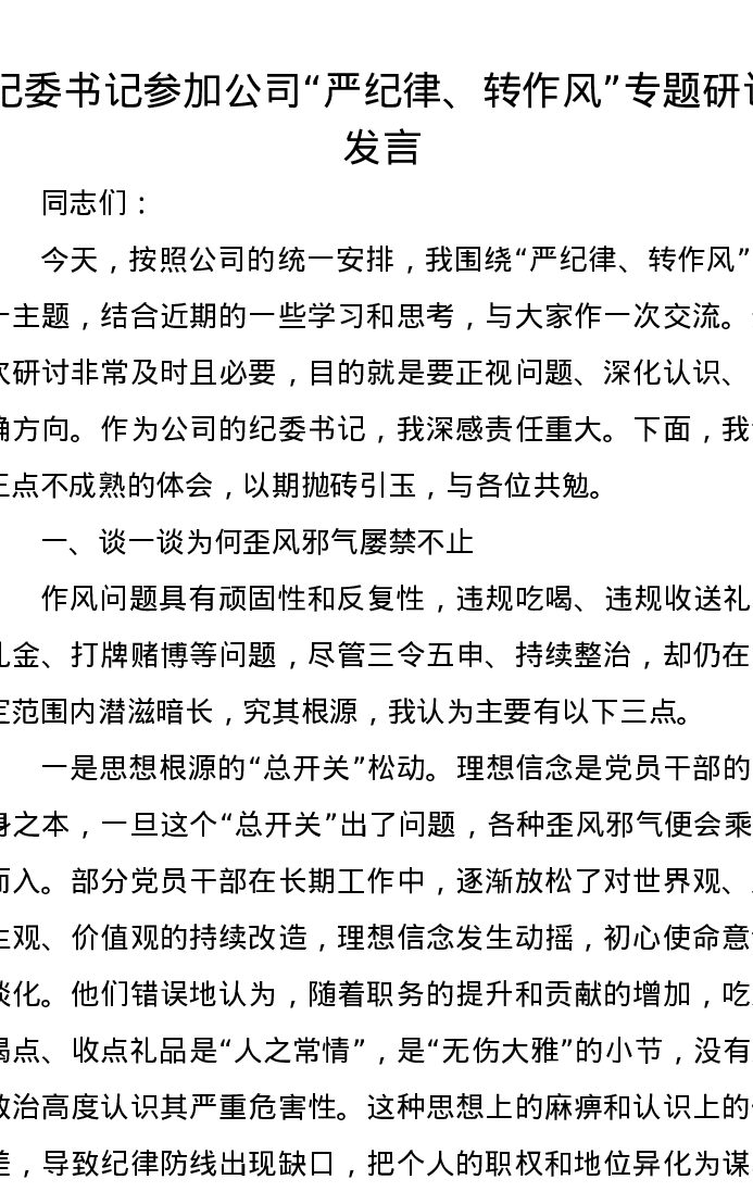 纪委书记参加公司严纪律、转作风专题研讨发言