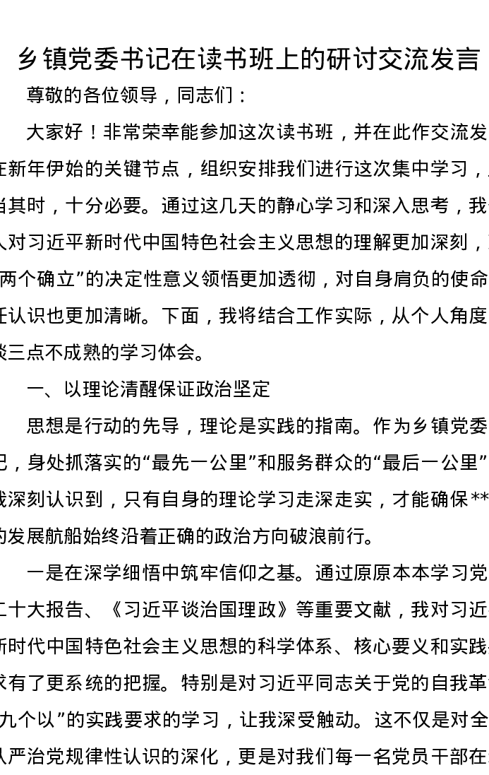 乡镇党委书记在读书班上的研讨交流发言