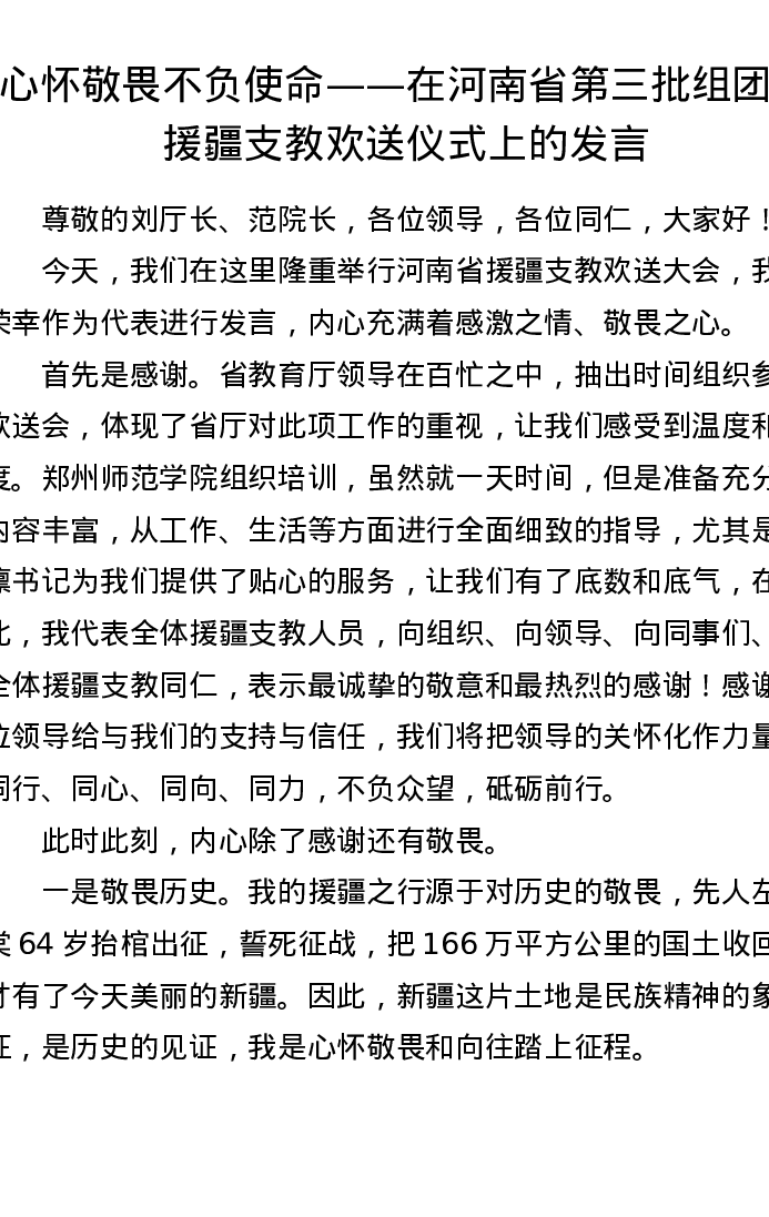 心怀敬畏不负使命——在河南省第三批组团式援疆支教欢送仪式上的发言