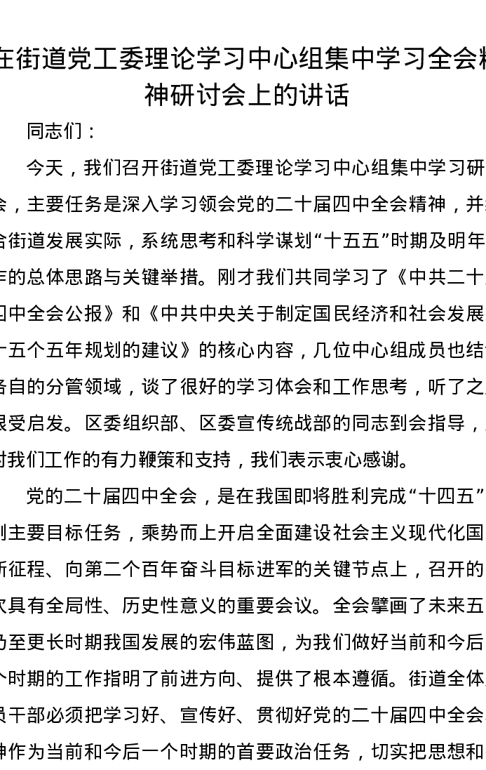 在街道党工委理论学习中心组集中学习全会精神研讨会上的讲话