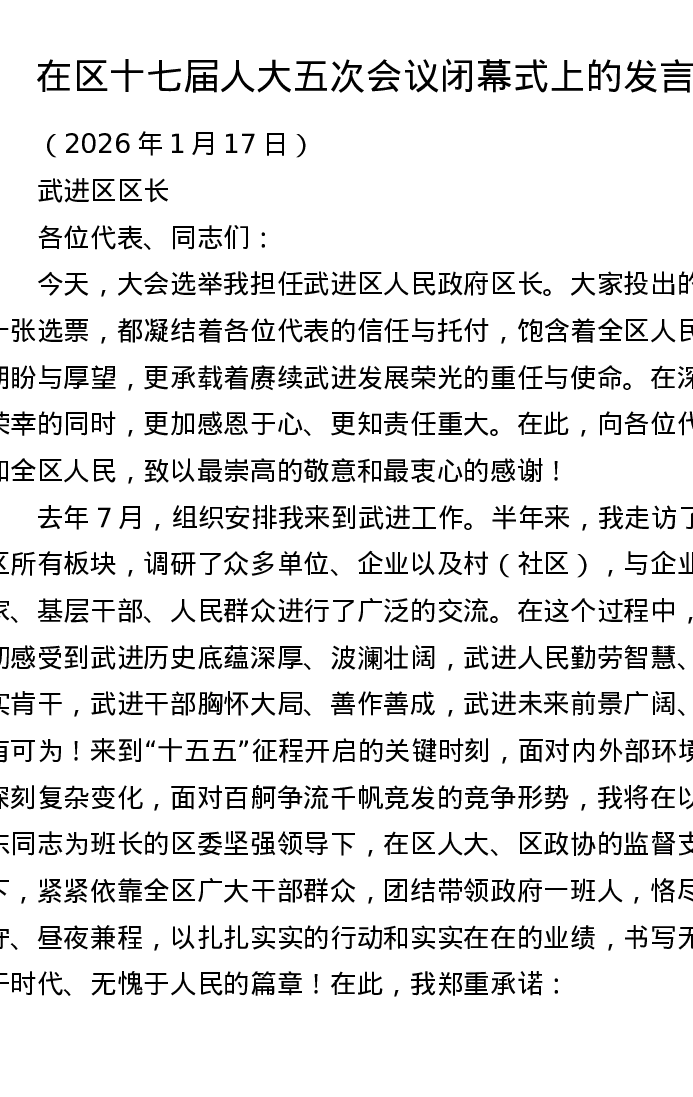 在区十七届人大五次会议闭幕式上的发言