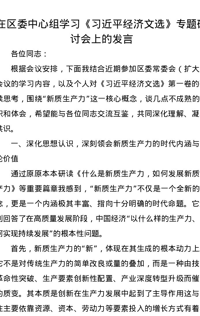 在区委中心组学习《习近平经济文选》专题研讨会上的发言
