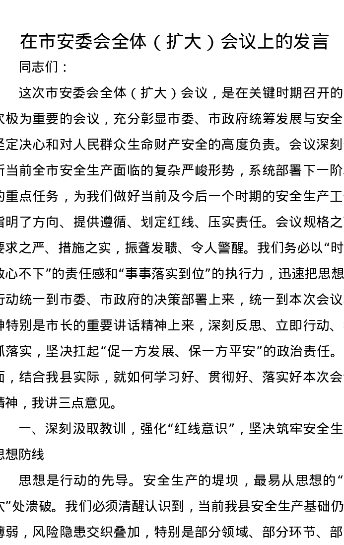 在市安委会全体(扩大)会议上的发言