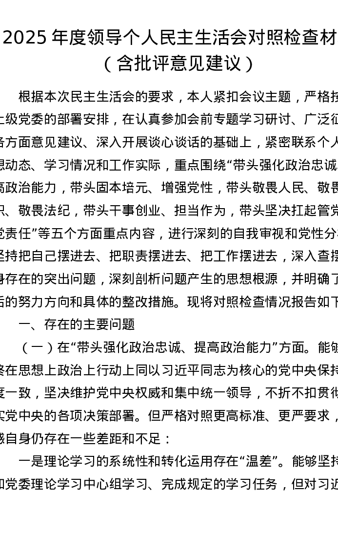 2025年度领导个人xxxxx对照检查材料(含批评意见建议)