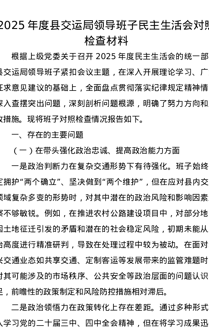 2025年度县交运局领导班子xxxxx对照检查材料